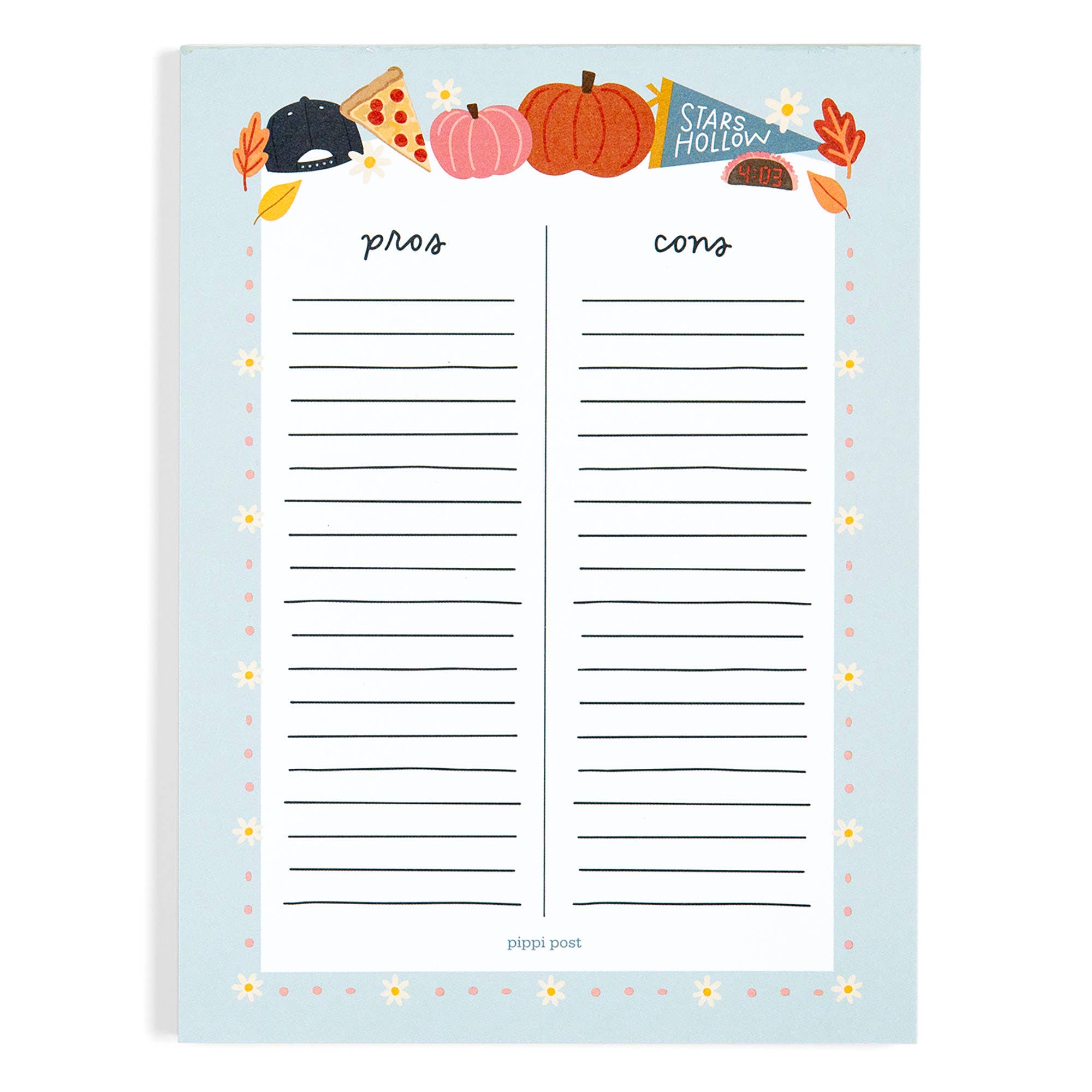 Jot it all down—Stars Hollow style! This 6x8 Pros & Cons Notepad is perfect for helping you make decisions big or small, with a little help from pumpkins, pizza, and the charm of a certain cozy small town. With hand-drawn fall icons and a clear, lined layout, it’s just right for organizing your thoughts, planning your next move, or even daydreaming about your favorite TV town. Great for Gilmore Girls fans, stationery lovers, and cozy season gift baskets alike. Keep it on your desk, tuck it in your planner, or gift it to a fellow decision-maker. Notepad, list pad, planner accessory—whatever you call it, it’s a must-have! Features: 52 sheets, lined, chipboard backer Size: 6×8" Design: Stars Hollow; Pros, Cons