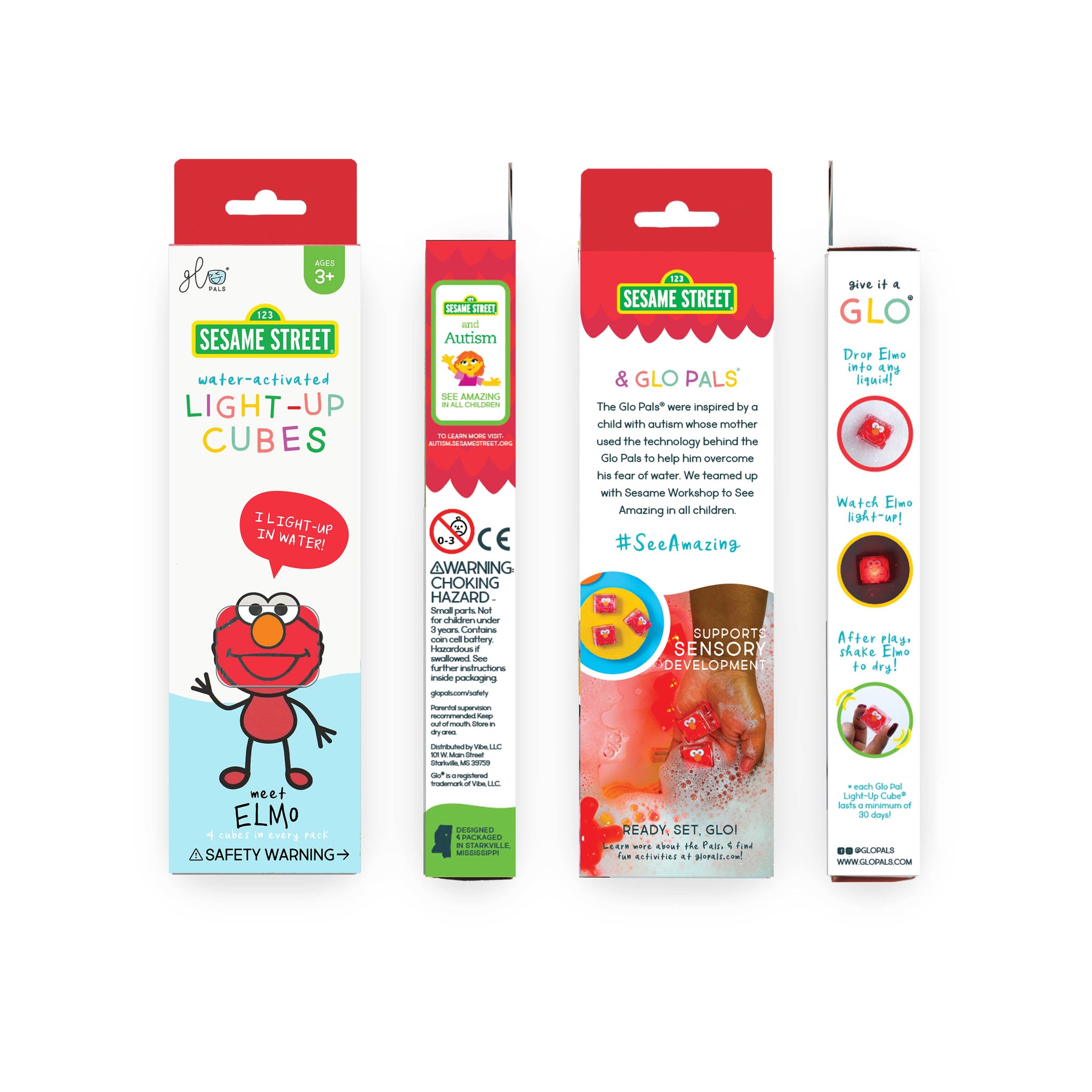 NOT AVAILABLE FOR INTERNATIONAL DISTRIBUTION We’ve teamed up with our Pals on Sesame Street to create an exclusive line of Glo Pals featuring everybody’s favorite furry friend - Elmo! We are bringing sunny days in a whole new way! Just drop in any liquid and watch them come to life. INCLUDES: 4 Glo Pals Light-Up Cubes AGES: 3 years old + Hand packaged and shipped with love from Starkville, MS