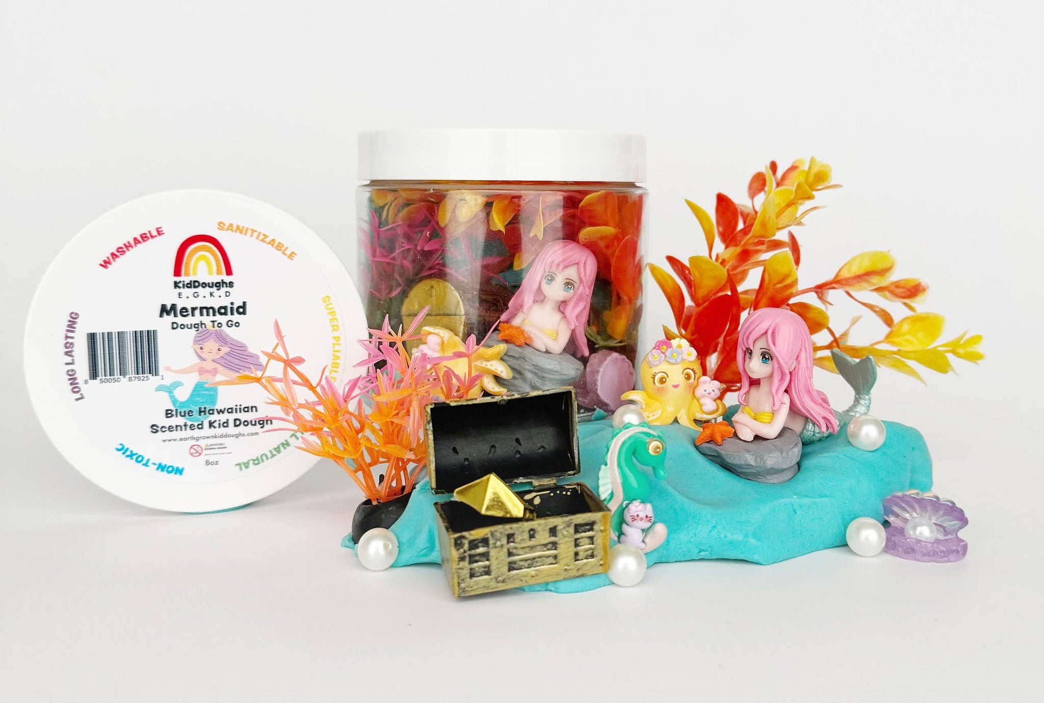 Includes: 8 oz Light Blue (Blue Hawaiian) KidDough, Mermaid Figurine, Octopus Charm, Sea Horse Charm, Pearls, Clamshell Charm, Colorful Aquatic Plants and a Treasure Chest Filled with Treasure